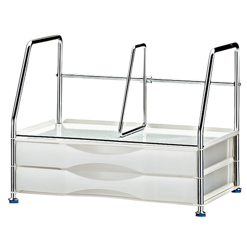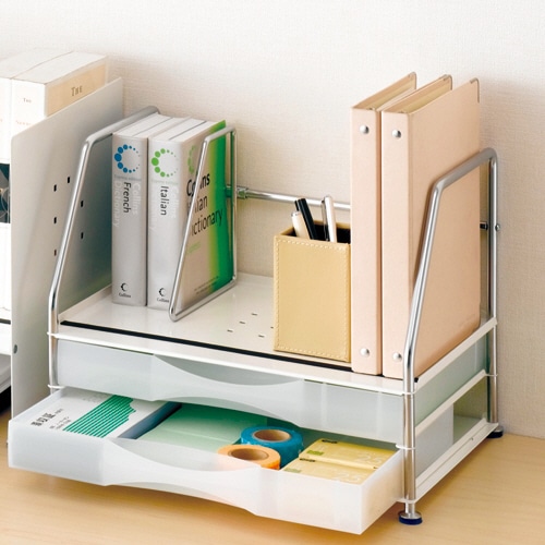 | 商品仕様 | ●種類/ブックスタンド ●色/ホワイト ●寸法/W350×D251×H268mm ●材質/フレーム:スチール(クロームメッキ)、トレー:スチール(粉体塗装)、レターケース:再生PS樹脂 ●付属品/足ゴムに耐震ゲルマット ●その他仕様/●レターケース2段 ●レターケース内寸:W315×D218×H36mm ●耐荷重:10kg ●備考/※プラスドライバーをご用意ください |