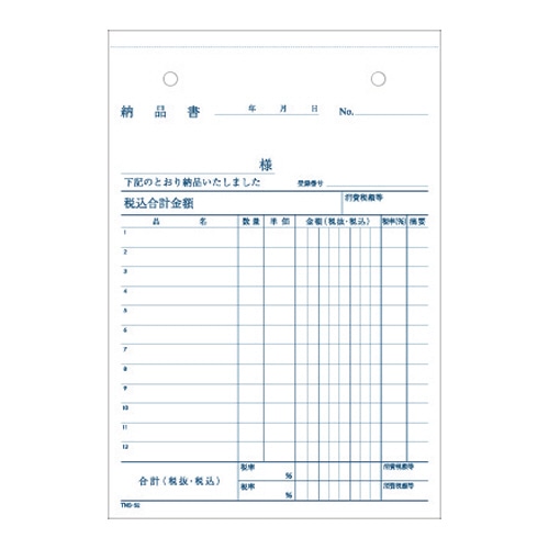 商品仕様 | ●サイズ/B6タテ ●寸法/タテ188×ヨコ128mm ●伝票タイプ/複写式 ●複写枚数/3枚 ●行数/12行 ●とじ穴/2穴 ●とじ穴間隔/80mm ●カーボン/ノーカーボン複写 ●その他仕様/●納品書(請求付) |