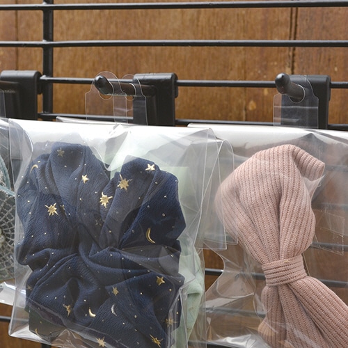 ●今まで棚置きしていた商品も、糊付きフックの取付けでフック陳列ができ、売り場スペースを有効活用できます。裏面がシールになっています。挟んでお使いください。