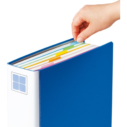 商品仕様 | ●サイズ/A4タテ ●色/5色 ●山数/10山 ●対応穴数/2穴 ●寸法/タテ302×ヨコ222mm ●山寸法/上側山サイズ:W27×H5mm、横側山サイズ:W12×H27mm ●厚さ/0.4mm ●材質/ポリプロピレン(半透明) ●その他仕様/●とじ穴間隔:80mm ●付属品:紙製目次ページ1枚(縦297×横210mm)、紙製サイドインデックス用シール白2つ折り(23×23mm・10片) |