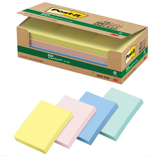 3M ポスト・イット エコノパック ノート 再生紙 75×50mm 混色 6561-K20 1パック(12冊)