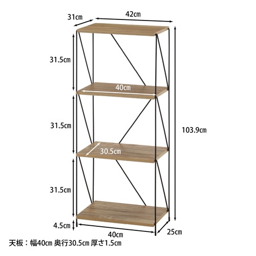 | 商品仕様 | ●タイプ/オープンタイプ ●段数/4段 ●外寸/W420×D310×H1039mm ●重量/7100g ●色/オークナチュラル ●有効内寸/W400×D305mm ●耐荷重/10kg ●材質/構造部材(フレーム):金属(鋼)、表面材(棚板):プリント紙化粧パーティクルボード ●必要工具/なし ●製造国/マレーシア ●その他仕様/●棚板厚:15mm ●備考/※耐荷重は棚板1枚あたり。 |