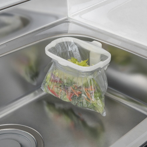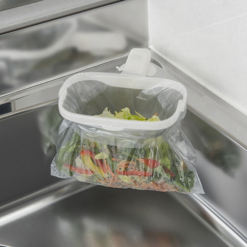 | 商品仕様 | ●材質/リング:ポリプロピレン、吸盤:塩化ビニール、補助板:ポリエステル、専用袋:ポリエチレン ●その他仕様/●パック内容:本体リング+専用袋5枚付 ●寸法:[リング]H170×W120mm、[ホルダー]H30×W90mm、[専用袋]H310×W240×厚さ0.01mm |