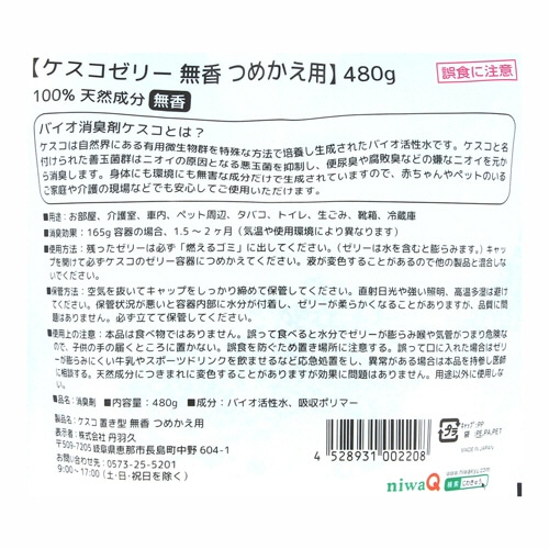 | 商品仕様 | ●タイプ/詰替 ●香り/無香 ●内容量/480g ●使用推奨空間/お部屋、介護室、車内、ペット周辺、タバコ、トイレ、生ゴミ、靴箱、冷蔵庫 ●持続時間/165g容器の場合、開封後1.5~2ヵ月(季節や使用状況により異なります。) ●成分/バイオ活性水、吸収ポリマー ●備考/※メーカーの都合により、パッケージおよび仕様が変更になる場合がございます。 ●シリーズ名/Kesco(ケスコ) |