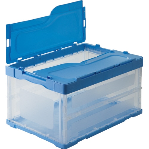 ●フタ一体型、容量40L、ブルー/透明の折りたたみコンテナ。