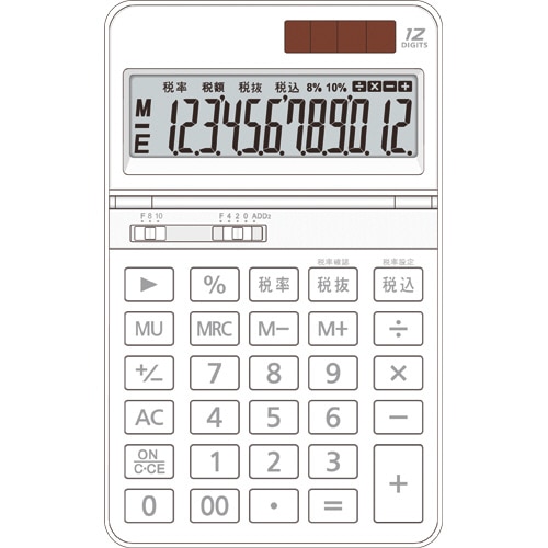 | 商品仕様 | ●桁数/12桁 ●寸法/W110×D178×H26mm ●質量/約170g ●色/ホワイト ●メモリー/3キー方式メモリー ●機能/早打ち対応キー、税計算、計算状態表示、小数点指定スイッチ、サインチェンジキー、税率指定と自由設定スイッチ 、専用電池カバー ●表示部/チルト ●電源/ソーラー+ボタン型電池 ●保証期間/1年 ●備考/※重量は電池含む。 |