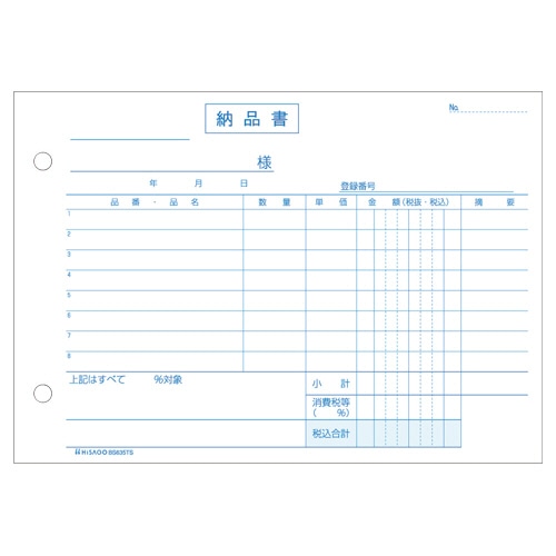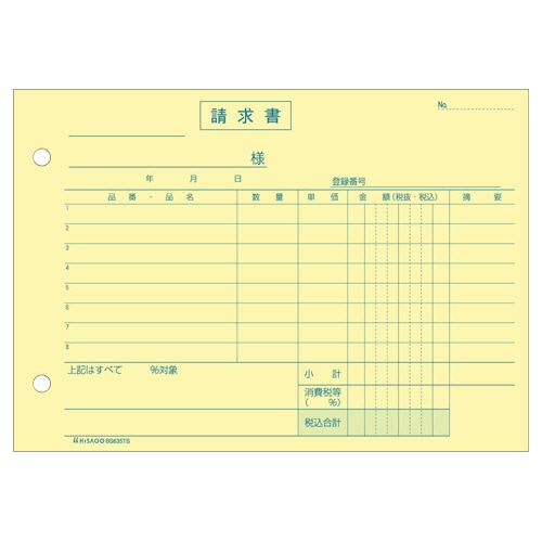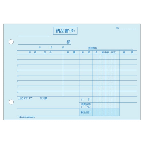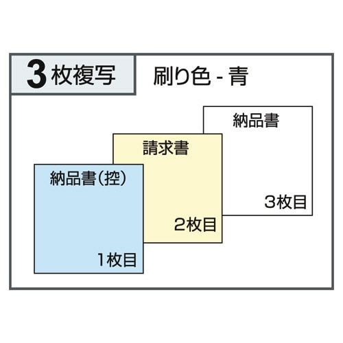 商品仕様 | ●サイズ/B6ヨコ ●寸法/タテ128×ヨコ187mm ●伝票タイプ/複写式 ●複写枚数/3枚 ●行数/8行 ●とじ穴/2穴 ●とじ穴間隔/80mm ●カーボン/ノーカーボン(青色発色) ●消費税欄/あり ●その他仕様/●単独税率記載タイプ ●刷色:青 ●複写内訳:1枚目/納品書(控)、2枚目/請求書、3枚目/納品書 ●ミシン目切り離し後のサイズ:B6ヨコ(128×182mm) ●下敷付(切取) |