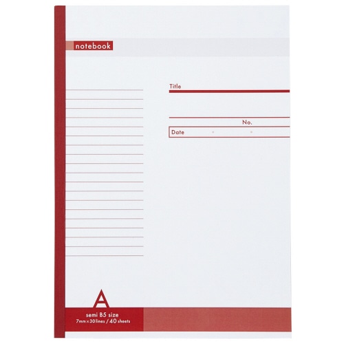 | 商品仕様 | ●サイズ/セミB5 ●寸法/タテ252×ヨコ179mm ●製本様式/無線とじ ●枚数/40枚 ●罫/A罫 ●罫幅/7mm ●行数/30行 ●表紙色/レッド ●材質/上質紙 |