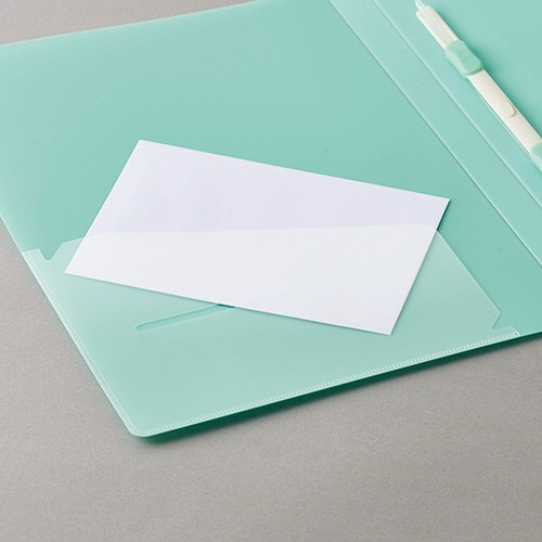 ●書類や名刺の一時保管に便利な透明ポケット付。