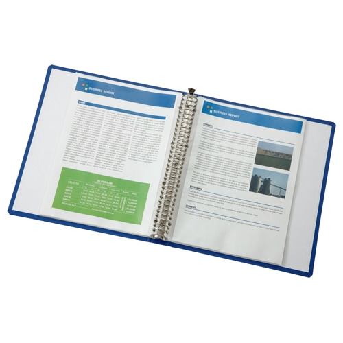 ●丁寧な造りの「貼り表紙」。最大収容枚数:約130枚、青のクリヤーファイル。100冊のセットです。