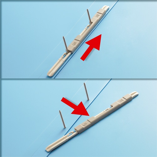 ●とじ具に2つの便利機能。とじ足が自然に自立するから、書類の抜き差しがカンタン!スライド機構とじ具は片手でカンタンに開閉可能!