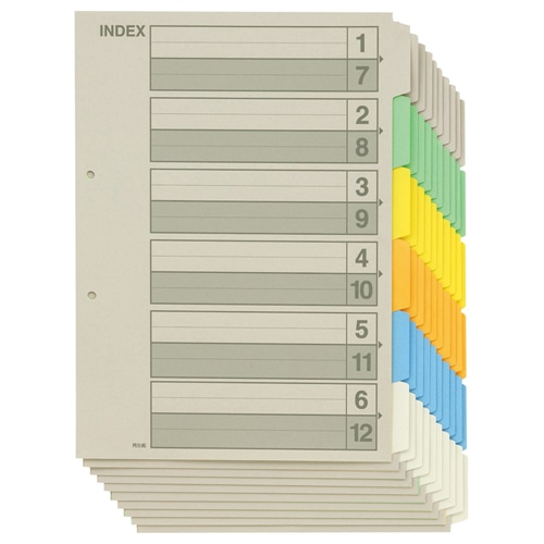 | 商品仕様 | ●サイズ/A4タテ ●色/6色 ●山数/6山 ●対応穴数/2穴 ●寸法/タテ297×ヨコ210(+12)mm ●山寸法/W12×H42mm ●厚さ/約0.13mm ●材質/再生紙 ●重量/370g ●備考/紙厚は季節により変化する場合があります。 |