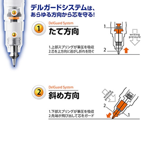 ●芯に大きな負荷がかかるとペン先端が出て芯を守る「デルガードシステム」採用。
