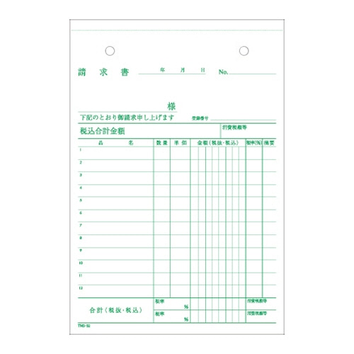 商品仕様 | ●サイズ/B6タテ ●寸法/タテ188×ヨコ128mm ●伝票タイプ/複写式 ●複写枚数/3枚 ●行数/12行 ●とじ穴/2穴 ●とじ穴間隔/80mm ●カーボン/ノーカーボン複写 ●その他仕様/●納品書(請求付) |