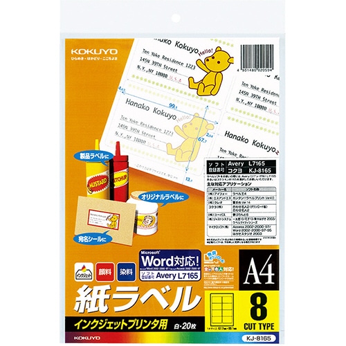 コクヨ インクジェットプリンタ用 紙ラベル(スタンダードラベル) A4 8面 67.7×99.1mm KJ-8165 1セット(100シート:20シート×5冊)