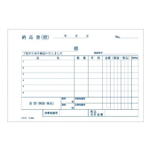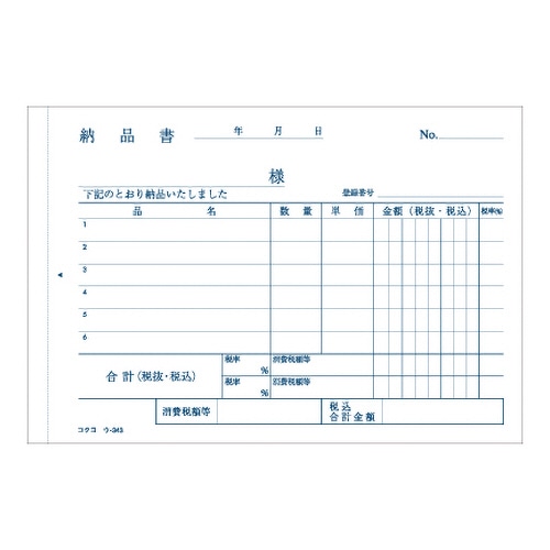 ●軽減(複数)税率対応、ノーカーボン・A6ヨコ型・3枚複写(受領付)の納品書、10冊セットです。