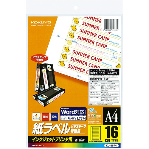 コクヨ インクジェットプリンタ用 紙ラベル(スペシャルラベル) A4 ビデオテープ・背面用16面 KJ-8674 1セット(50枚:10枚×5冊)