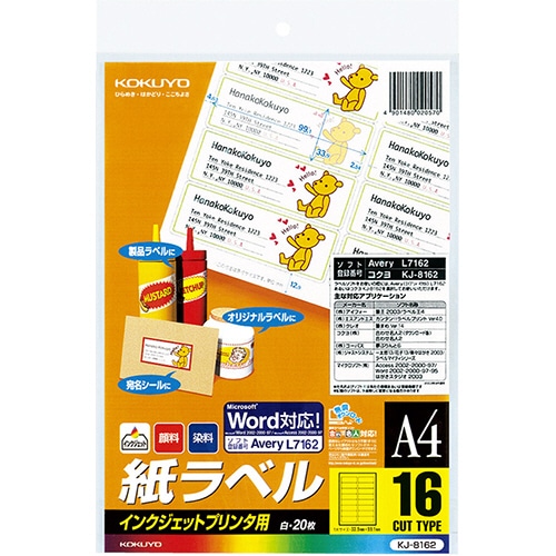 コクヨ インクジェットプリンタ用 紙ラベル(スタンダードラベル) A4 16面 33.9×99.1mm KJ-8162 1セット(100シート:20シート×5冊