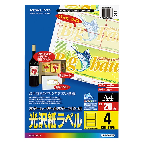 コクヨ カラーレーザー&カラーコピー用光沢紙ラベル A4 4面 65×190mm LBP-G6905 1セット(100シート:20シート×5冊)