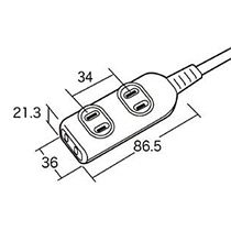 商品仕様 | ●コンセント仕様/2P(トラッキング火災予防絶縁キャップ付きスイングプラグ) ●コンセント数/3個 ●定格容量/15A・125V(1500Wまで) ●ケーブル長さ/3m ●寸法/W86.5×D36×H21.3mm |