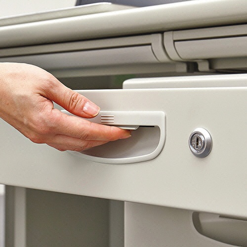 すべての引き出しにラッチ機構を搭載したLEOオフィスデスク。