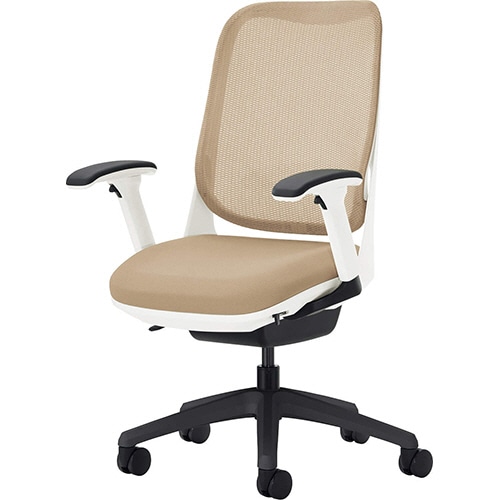 ●フレキシブルアームで背座色サンドベージュ(ブラック脚・フレームはホワイト)のオフィスチェア「ライド」。