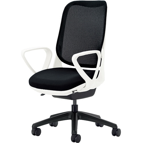 ●サークルアームで背座色ブラック(ブラック脚・フレームはホワイト)のオフィスチェア「ライド」。