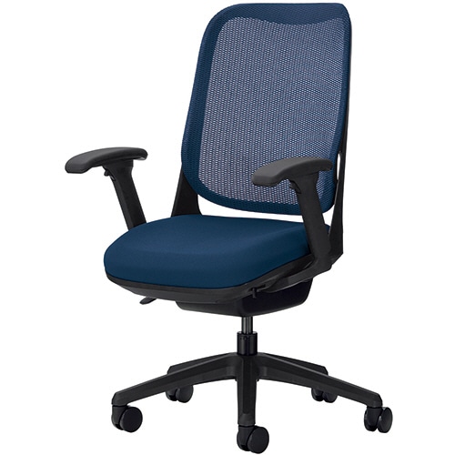 ●フレキシブルアームで背座色コズミックブルー(ブラック脚・フレームはブラック)のオフィスチェア「ライド」。