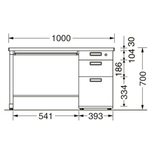 ●右袖が3段の幅1000mmナチュラルの片袖机。