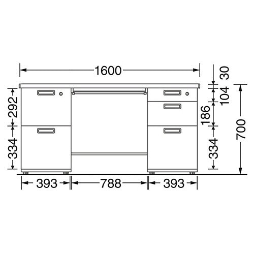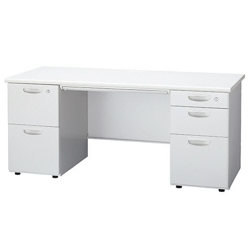 商品仕様 | ●タイプ/両袖机 ●外寸/W1600×D700×H700mm ●重量/69kg ●色/ホワイト ●センター引出数/1 ●センター引出有効内寸/W757×D349×H39mm ●右袖引出段数/3段 ●右袖引出有効内寸/上段:W317×D430×H92mm、中段:W317×D430×H180mm、下段:W317×D430×H302mm ●左袖引出段数/2段 ●左袖引出有効内寸/上段:W317×D430×H274mm、下段:W317×D430×H302mm ●機能/コード落し、ラッチ機構、オールロック ●耐荷重/天板:約80kg ●材質/天板:スチール・メラミン化粧板(ポストフォーム加工)、本体:スチール(粉体塗装) ●脚部仕様(キャスター/アジャスター)/アジャスター ●カギ/左右各2本付(センター引出除く) ●製造国/日本 ●付属品/仕切板(大)3枚・(中)1枚・ペントレー1個 ●保証期間/外装・表面仕上げ:1年、機構部・可動部:2年、構造体:3年 ●その他仕様/●天板厚:30mm |