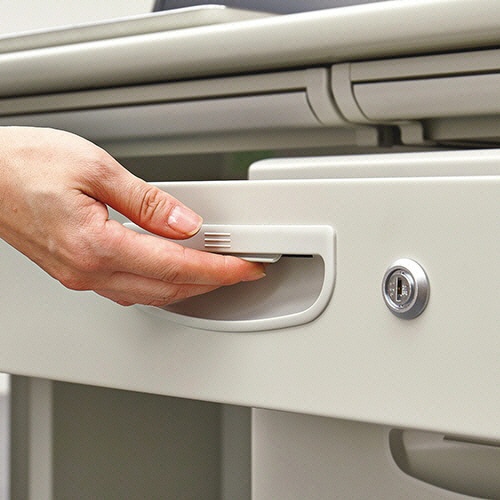 すべての引き出しにラッチ機構を搭載したLEOオフィスデスク。