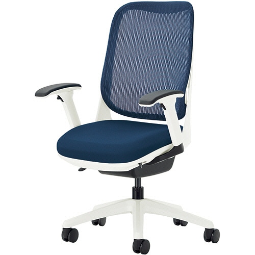 ●フレキシブルアームで背座色 コズミックブルー(ホワイト脚・フレームはホワイト)のオフィスチェア「ライド」。