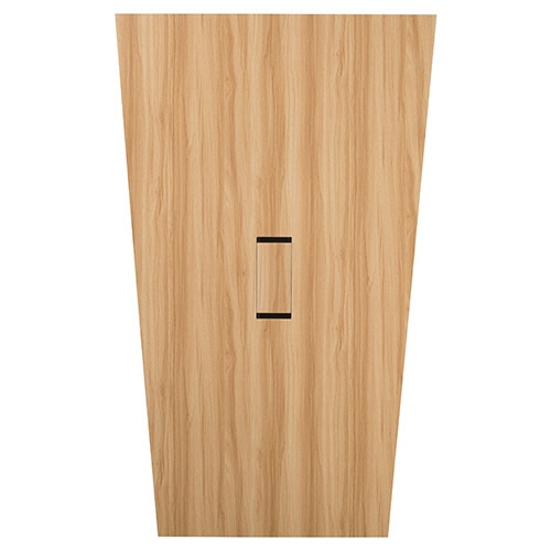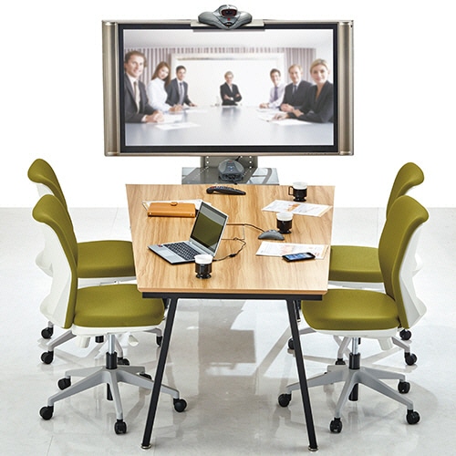 ●TV会議やホワイトボードに向かう打ち合わせで参加者が見えやすいように工夫したナチュラルの台形テーブル。