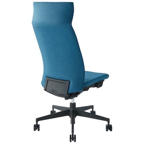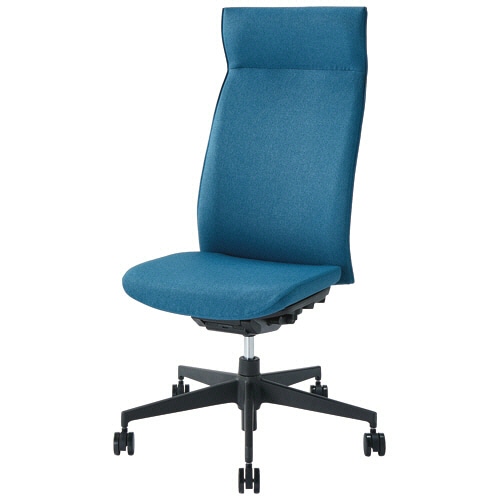 ●ファブリックで首へのあたりがやわらかいヘッドレスト一体型のハイバックタイプ。背と座は圧迫感のないスリムスタイルで色はブルーです。