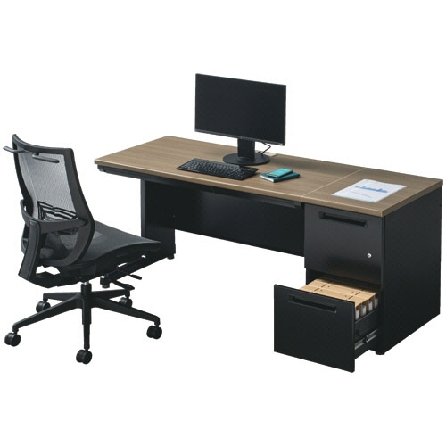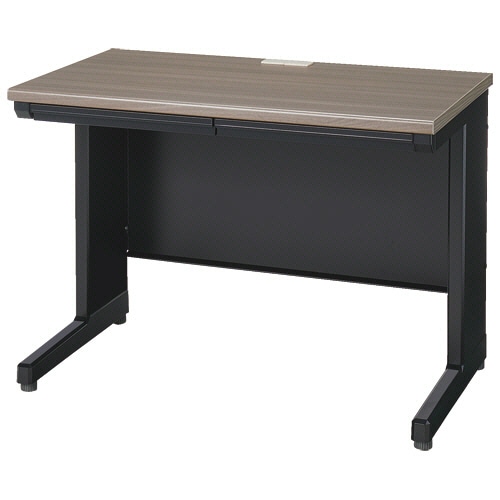 ●幅1000×奥行600mmの省スペースタイプ。天板がアッシュブラウン、本体がブラックの平机です。