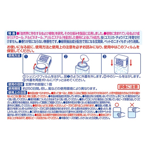 ●ビーズに浸透した有効成分が徐々に揮散するので安定した効果が約250日間持続します。また、ビーズの離液や変色がないので、最後まで見た目もきれいなまま使えます。