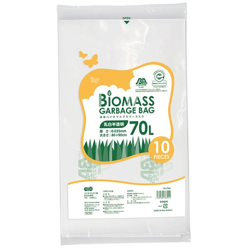 | 商品仕様 | ●容量/70L ●色/乳白半透明 ●寸法/タテ900×ヨコ800×マチmm ●厚さ/0.035mm ●材質/低密度ポリエチレン+バイオマスプラ25% ●その他仕様/●BPマーク印刷あり ●容 量/70 |