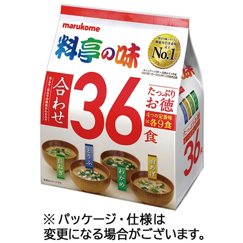 商品仕様 ●アソート内容/36食入(わかめ、長ねぎ、とうふ、油あげ×各9食)