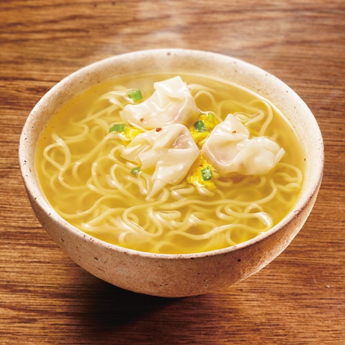 ●鶏と昆布のだしをベースに旨みを掛け合わせたスープ、かやくにわんたんが入った塩ラーメン。12食セット。