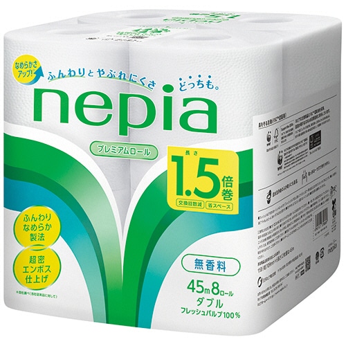 | 商品仕様 | ●タイプ/ダブル ●ロールサイズ/幅約109mm×長さ45m ●ミシン目/あり ●香り/なし ●芯/あり ●芯径/約38mm ●材質/パルプ100% ●パッケージサイズ/W228×D216×H222mm ●生産国/日本 ●シリーズ名/ネピア |