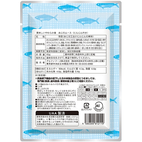 アルファフーズ UAA食品 美味しいやわらか食 あじのムース(にんじん付) 1セット(50食)