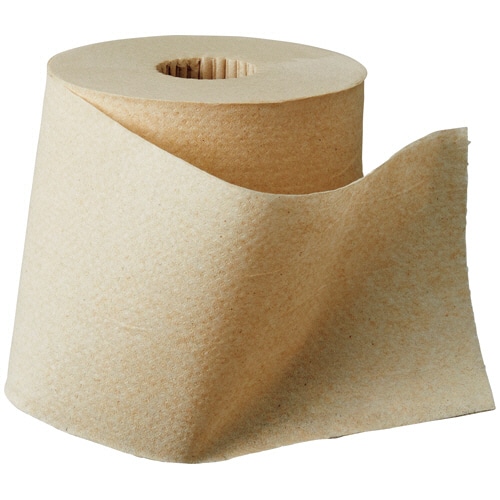 段ボールをリサイクルしたトイレットペーパー。長く巻いた芯なしタイプ。