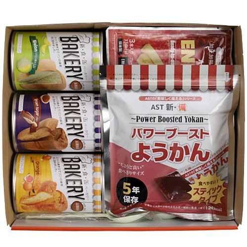 商品仕様 | ●セット内容/新食缶ベーカリー(黒糖・メロン・オレンジ 100g×各1缶)、AST新・備 玄米リゾット(和風・トマト・カレー 240g×各1袋、個包装プラスチックスプーン×3本)、AST新・備 ENE BARクッキー(3本入り(70g)×3袋)、AST新・備 パワーブーストようかん(45g×6本入×1袋) ●日数/3日 ●賞味期限/製造日より約5年 ●備考/※通常ご納品までに、2~3週間かかる場合がございます。また、需要期や非常時の場合、お届けまでに4週間以上かかる場合がありますことをご了承ください。 |