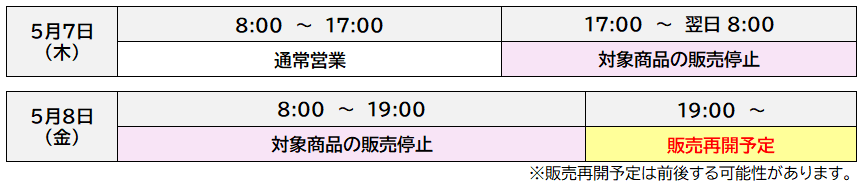 (全商品の販売再開は5月8日(金)20:00頃を予定)