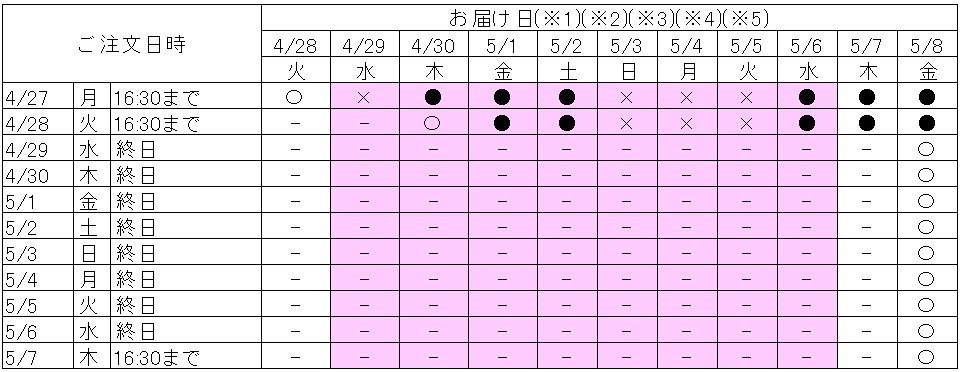 ゴールデンウィーク期間中の休業日およびお届けについてご案内させていただきます。